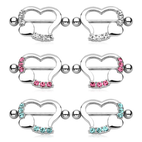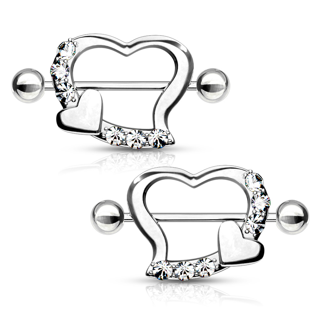 Šis ir divu satriecošu, sirds formas krūtsgala vairogu komplekts, kas vienā malā rotāts ar sešu mazu kristāliņu rindu un sirds dekoru.