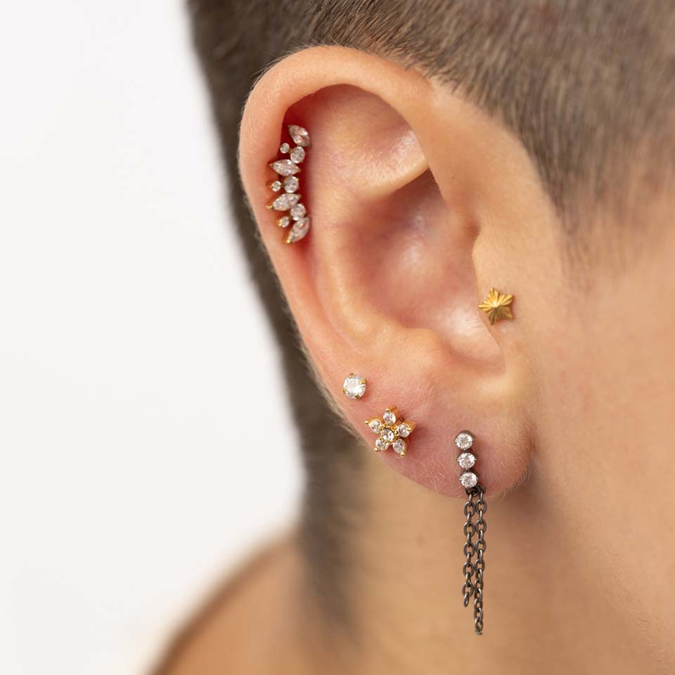 Novietojums: Tragus, Spiderbite, Snakebite, Medusa, Madonna, Lower labret, Auss ļipiņa, Helix, Conch, Forward helix, Angelbite