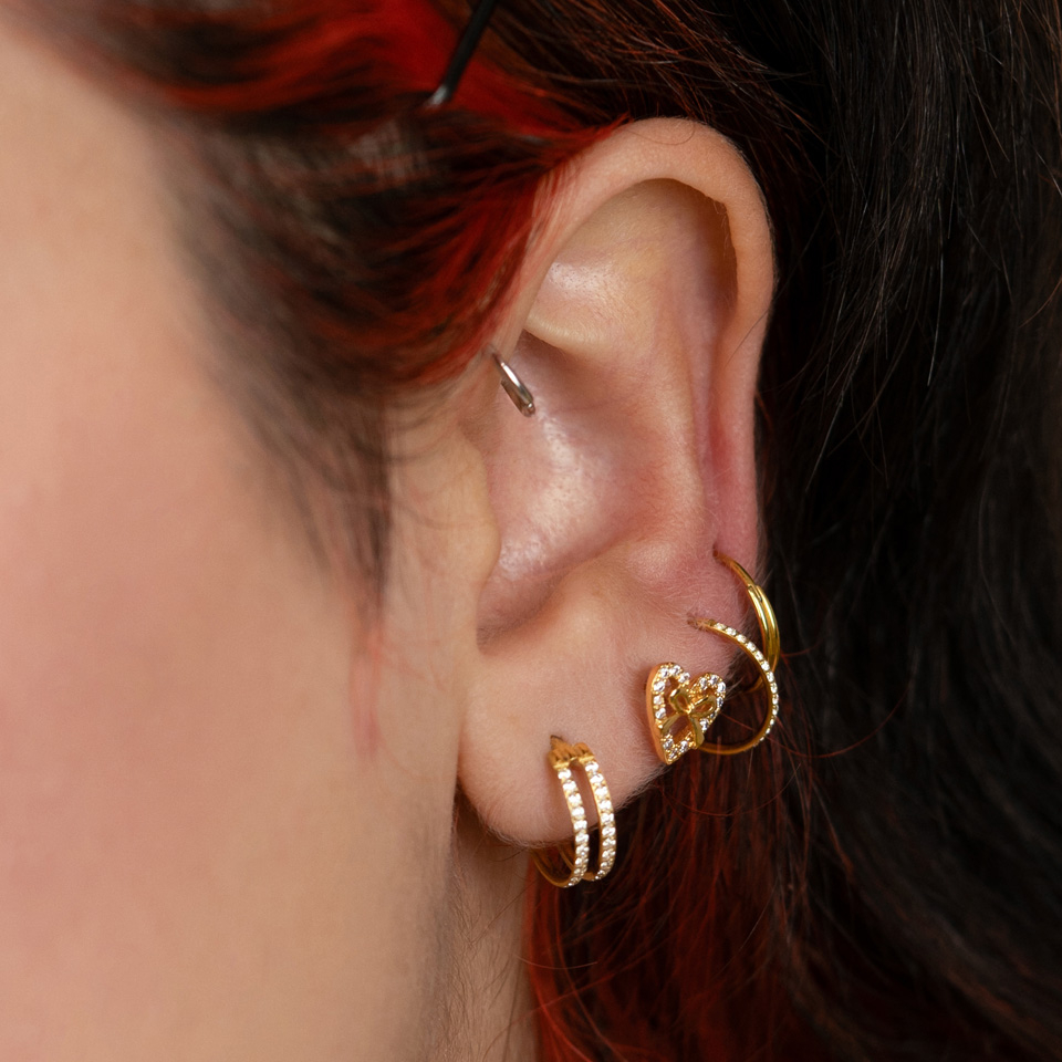 Novietojums: Tragus, Auss ļipiņa, Helix, Conch