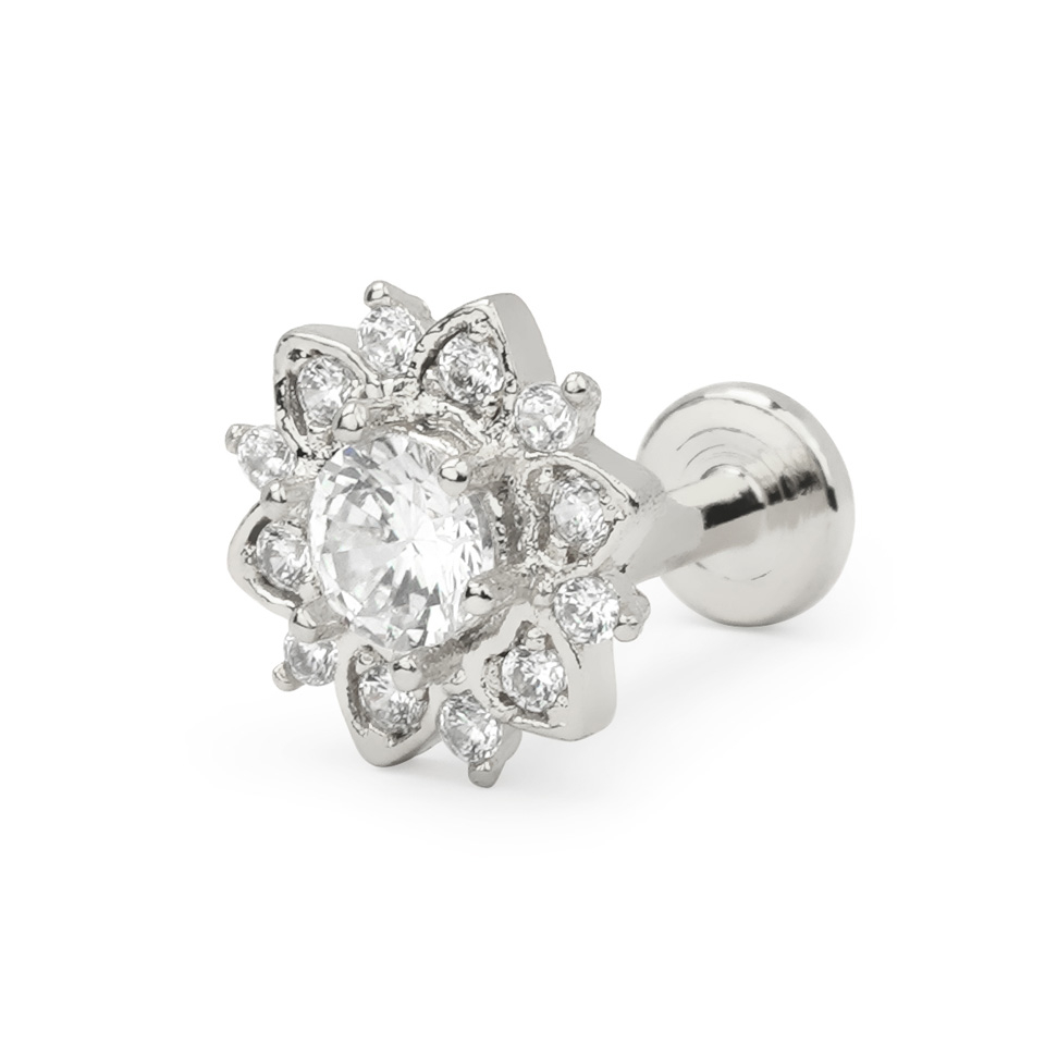 Augšdaļas dizains ir skaists, no misiņa izgatavots lotosa zieds. Šim modelim ir dažādu krāsu pārklājumi, sniedzot Tev plašākas izvēles iespējas: zelta, rozā zelta un sudraba. Lotosa zieda (8 mm) ziedlapiņas veido vairāki kristāldzidri akmentiņi, bet zieda viducīti - lielāks, slīpēts kristāls (3,5 mm).