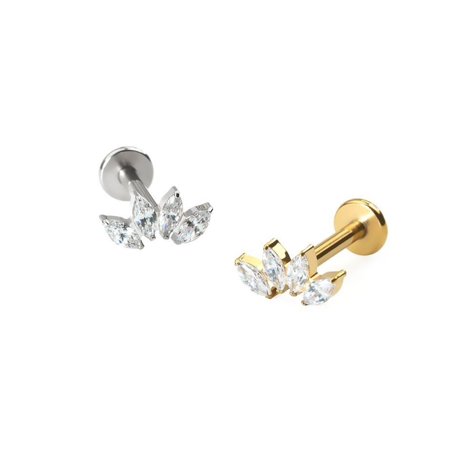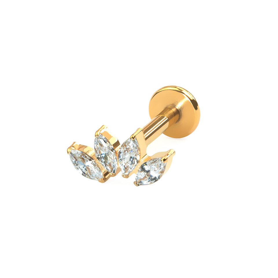 Šo smalko labreti rotā četri marķīzes slīpējuma cirkonija akmentiņi, kas izkārtoti lokā. Rotaslieta ir ideāli piemērota dažādiem auss pīrsingiem un jo sevišķi - conch vai flat pīrsingam. Labretei ir iekšējā vītne, kas nozīmē, ka Tev savā pīrsingā vienkārši jāievieto gludais rotas stienītis un jāuzskrūvē uzgalis, lai rotaslietu nostiprinātu. Labrete ir izgatavota no titāna, tādēļ to būs ērti nēsāt arī tiem, kam ir jūtīga āda.