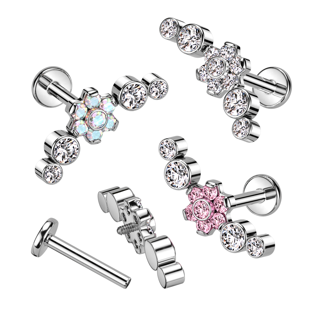 Piedāvātās labretes dekoratīvo elementu veido divi apaļi, aptuveni 2 mm lieli kristāli abās, aptuveni 4 mm liela centrālā kristāla ziediņa pusēs. Līdz ar to kopējais šī elementa garums ir aptuveni 14 mm.