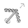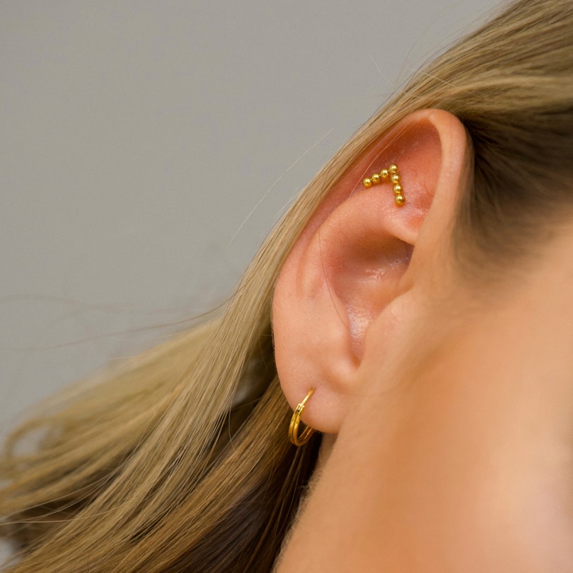 Piedāvāto titāna labreti rotā moderns uzgalis; septiņas 2 mm diametra lodītes veido divas 7,8 mm garas rindas, fiksētas ševrona jeb bultas formā. Savukārt labretei ir šīs rotas tipa standarta garums - 8 mm, un tā ir pieejama 1 mm un 1,2 mm garumā. Minētie izmēri ir piemēroti lielākajai daļai auss pīrsingu, piemēram, helix un auss ļipiņas pīrsingiem.