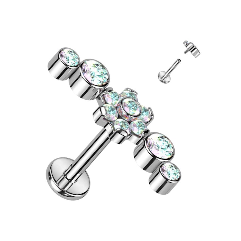 Piedāvātās labretes dekoratīvo elementu veido divi apaļi, aptuveni 2 mm lieli kristāli abās, aptuveni 4 mm liela centrālā kristāla ziediņa pusēs. Līdz ar to kopējais šī elementa garums ir aptuveni 14 mm.