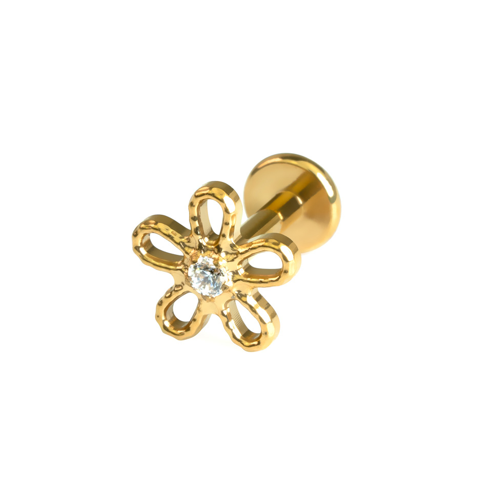 Mūsu brīnišķīgo margrietiņas formas labretes centru izgrezno cirkonija akmentiņš, kas piešķir mirdzumu. Tā kā rotaslietai ir iekšējā vītne, to ir viegli lietot - vienkārši ievieto savā pīrsingā gludo stienīti un uzskrūvē uzgali, lai rotu nostiprinātu. Izgatavota no hipoalerģiska titāna, tādēļ ideāli derēs jūtīgai ādai. Pieejama ar zelta vai sudraba krāsas pārklājumu, turklāt Tu vari izvēlēties arī savam pīrsingam atbilstošāko garumu. Padari savu tēlu mīlīgāku ar šo jaukā dizaina rotu.