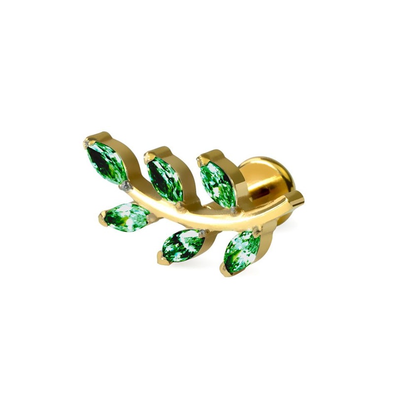 Skaista premium labrete lapas formā, kuru rotā 6 smalki marķīzes slīpējuma akmentiņi. Pieejama ar stilīgiem zaļiem vai klasiskiem caurspīdīgiem akmentiņiem, kā arī ar zelta vai sudraba krāsas pārklājumu. Šī rota kļūs par stilīgu papildinājumu Tavai auss rotu kombinācijai.
