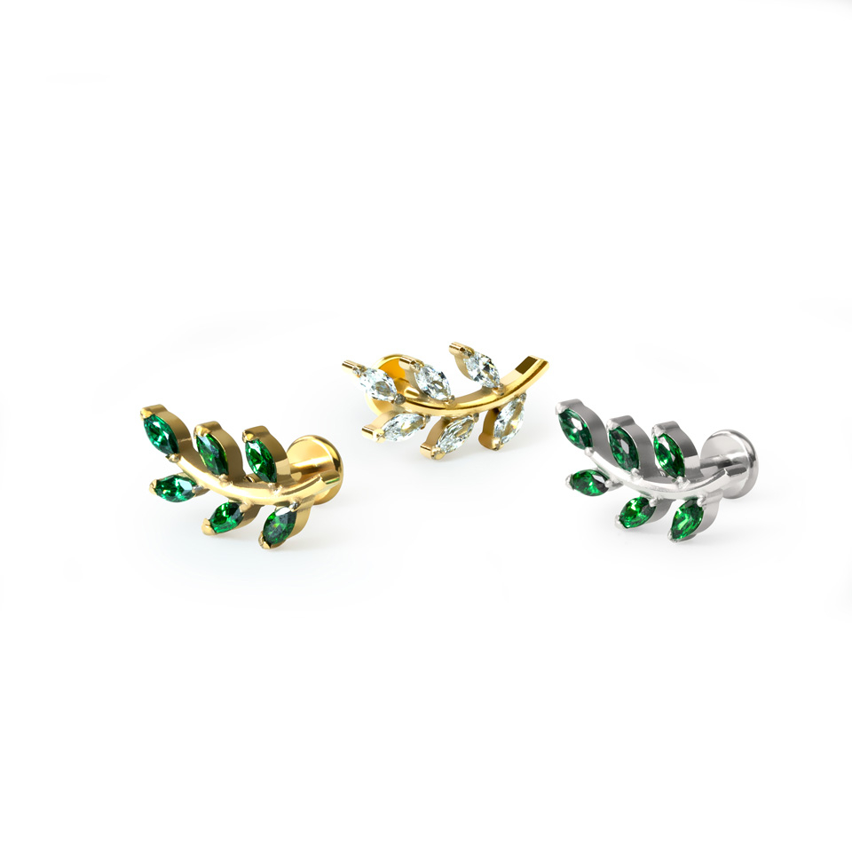 Skaista premium labrete lapas formā, kuru rotā 6 smalki marķīzes slīpējuma akmentiņi. Pieejama ar stilīgiem zaļiem vai klasiskiem caurspīdīgiem akmentiņiem, kā arī ar zelta vai sudraba krāsas pārklājumu. Šī rota kļūs par stilīgu papildinājumu Tavai auss rotu kombinācijai.