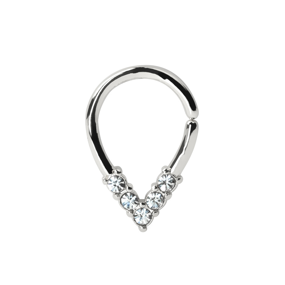 Šis vienlaidu pīrsingu gredzens ar spirālē sagriežamu aizdares mehānismu ir izveidots lāsītes formā un tā priekšpusi rotā 5 mazi akmentiņi. Tā kā rotaslieta ir izgatavota no ķirurģiskā tērauda, tā ir izturīga un nezaudēs savu spīdumu. Pieejama ar 1 mm un 1,2 mm biezu vītni, tādēļ to var nēsāt dažādos pīrsingos, tai skaitā (bet ne tikai) septum, tragus un helix.