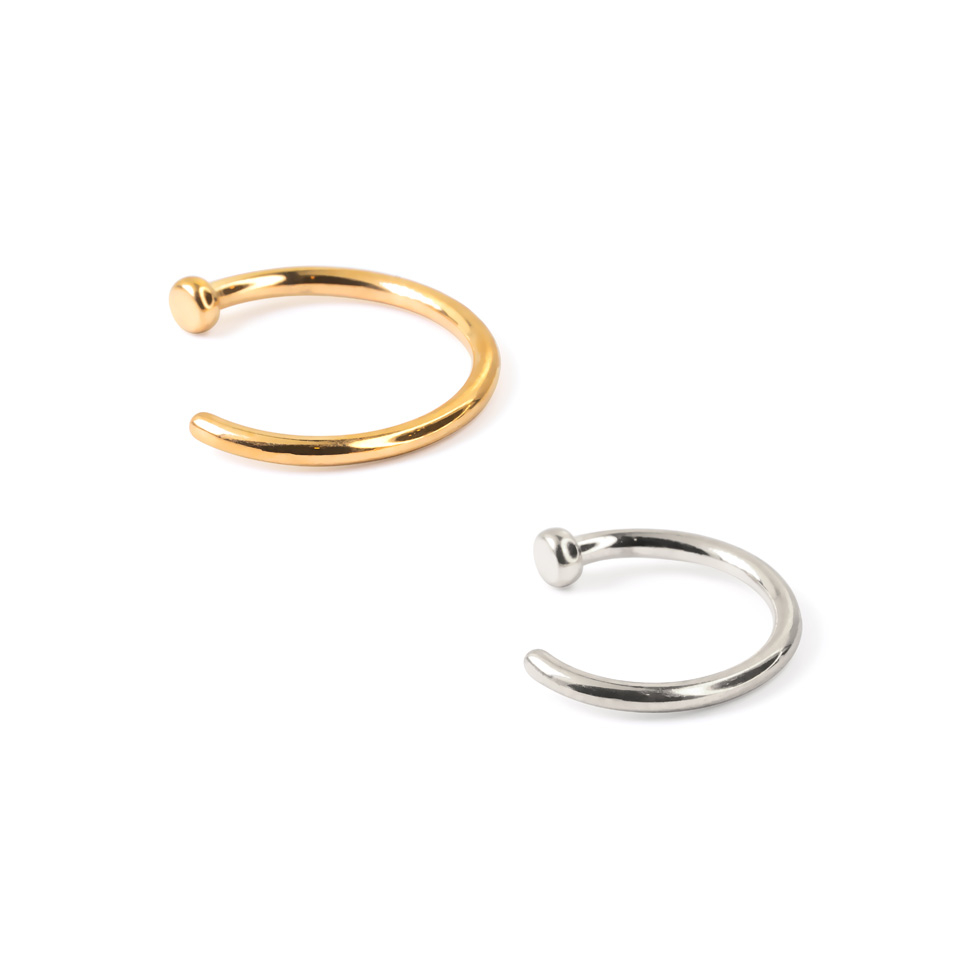 Tas ir pieejams attiecīgajos izmēros - 18g, 20g un 22g (1, 0.8, un 0.6 mm); tas derēs visu veidu deguna pīrsingiem, neatkarīgi no tā, vai tas ir caurdurts ar adatu vai nē. To ir viegli ielikt, turklāt, tas neizslīdēs ārā, pateicoties nelielajai, plakanajai pamatnītei, kura atrodas vienā tā galā. Fakts, ka tas nav viengabala riņķis, padara to ērti ievietojamu pīrsingā, lai gan tas pēc tāda izskatās, kad tas ir ievietots pīrsingā.