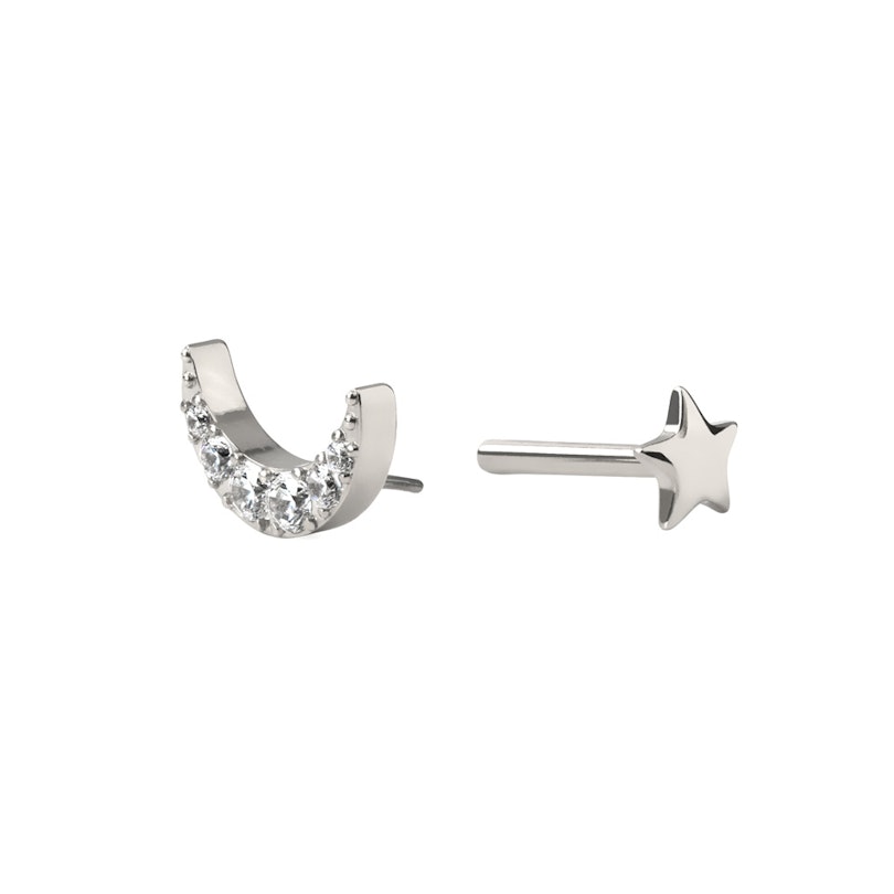 Šo skaisto titāna labreti rotā mēness, kas noklāts ar cirkonija akmentiņiem. Labretes plakanā zvaigznes formas aizmugure padara šo rotaslietu par perfektu nēsāšanai tādos pīrsingos, kuros redzamas abas rotas puses.