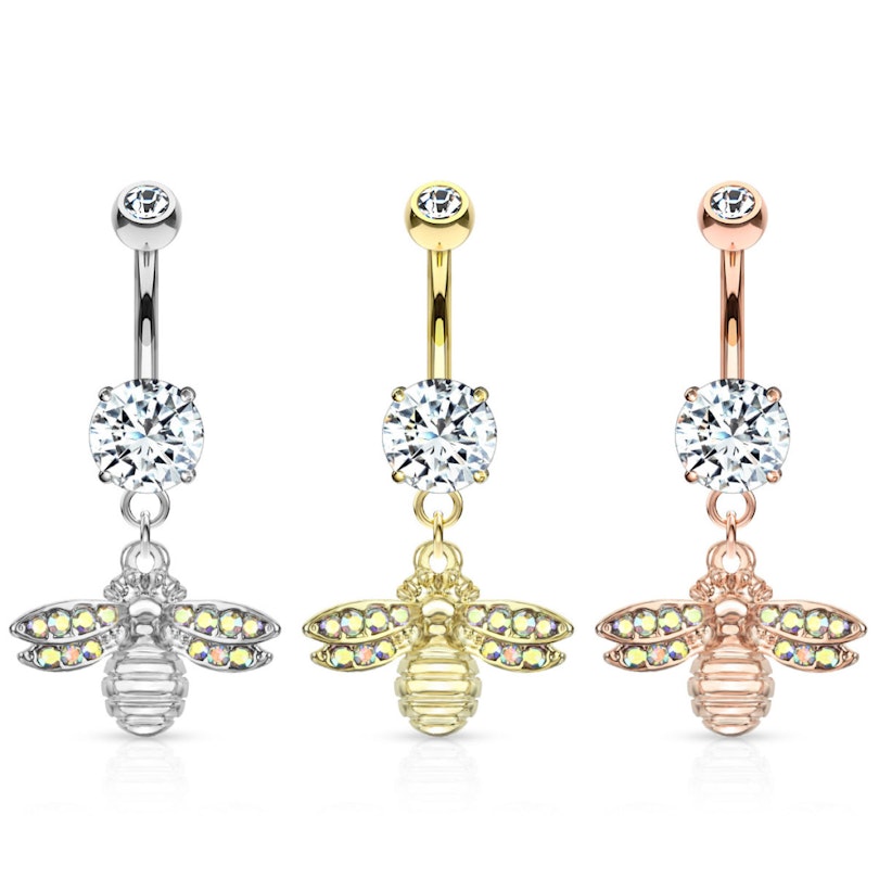 Attēlā redzamais nabas pīrsinga stienītis ir dekorēts ar jauku, nelielas bitītes piekariņu. Bite ir misiņa izstrādājums, un tās spārnus noklāj pāris mazi akmentiņi, kuri atstaro lielāko daļu varavīksnes krāsu. Mēs to saucam par aurora borealis, jo tās mums atgādina ziemeļblāzmu. Bitīte nokarājas no 3/8 collu (10 mm) gara un 14g (1.6 mm) bieza, izliekta stienīša. Tas ir izgatavots no ķirurģiskā tērauda, tāpat kā lielākā daļas nabas rotu, kuras atradīsiet veikalā.