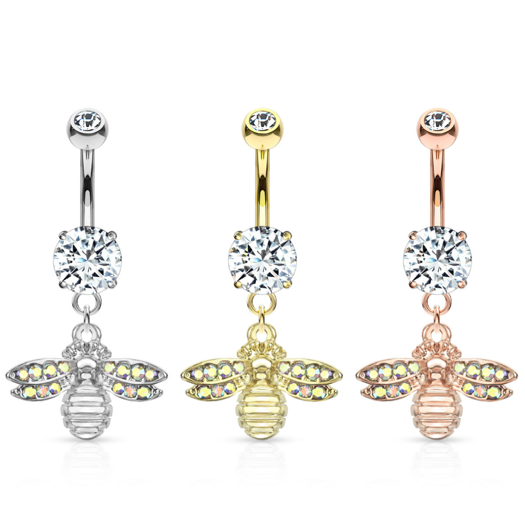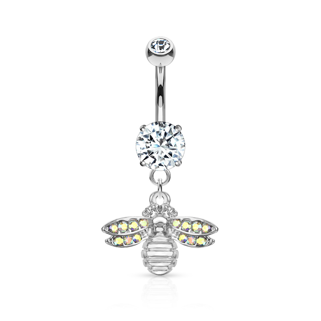 Attēlā redzamais nabas pīrsinga stienītis ir dekorēts ar jauku, nelielas bitītes piekariņu. Bite ir misiņa izstrādājums, un tās spārnus noklāj pāris mazi akmentiņi, kuri atstaro lielāko daļu varavīksnes krāsu. Mēs to saucam par aurora borealis, jo tās mums atgādina ziemeļblāzmu. Bitīte nokarājas no 3/8 collu (10 mm) gara un 14g (1.6 mm) bieza, izliekta stienīša. Tas ir izgatavots no ķirurģiskā tērauda, tāpat kā lielākā daļas nabas rotu, kuras atradīsiet veikalā.