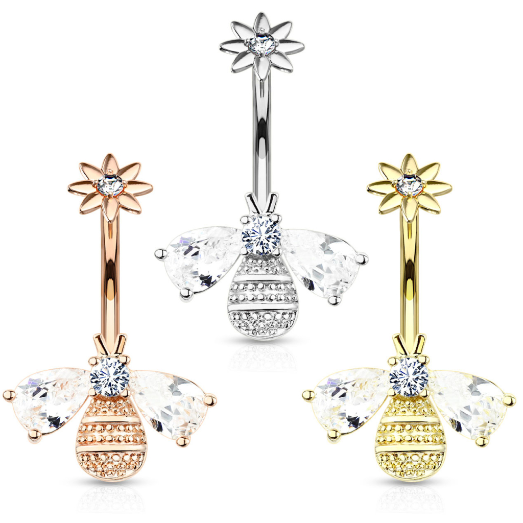 Nabas pīrsinga stienītim nav jāsastāv no augšdaļas uzgaļa un lielāka apakšdaļas uzgaļa. Tas var arī būt, šajā gadījumā, kreatīva rotaslieta ar papildu odziņu tās dizainā. Augšdaļas uzgalis ir ne tikai iekšēji vītņots, bet tam ir zieda formas uzskrūvējams uzgalis ar nelielu akmentiņu tā centrā. Ziedu ieskrūvē 3/8 collas (10 mm) izliektajā stienītī. Stienīša galā atrodas neliela bitītē ar diviem skaistiem akmens spārniņiem . Bitītes galva arī ir pilnībā izgatavota no akmens. Ķermenī ir iekļautas dažas detaļas, kas padara bitīti vēl dzīvāku. Šis nabas pīrsinga stienītis ir pieejams trīs dažādās krāsās. Kas atšķiras, ir metāla krāsa; pārējais ir identisks visos modeļos. Stienītis ir izgatavots no ķirurģiskā tērauda, bitīte ir misiņa izstrādājums.
