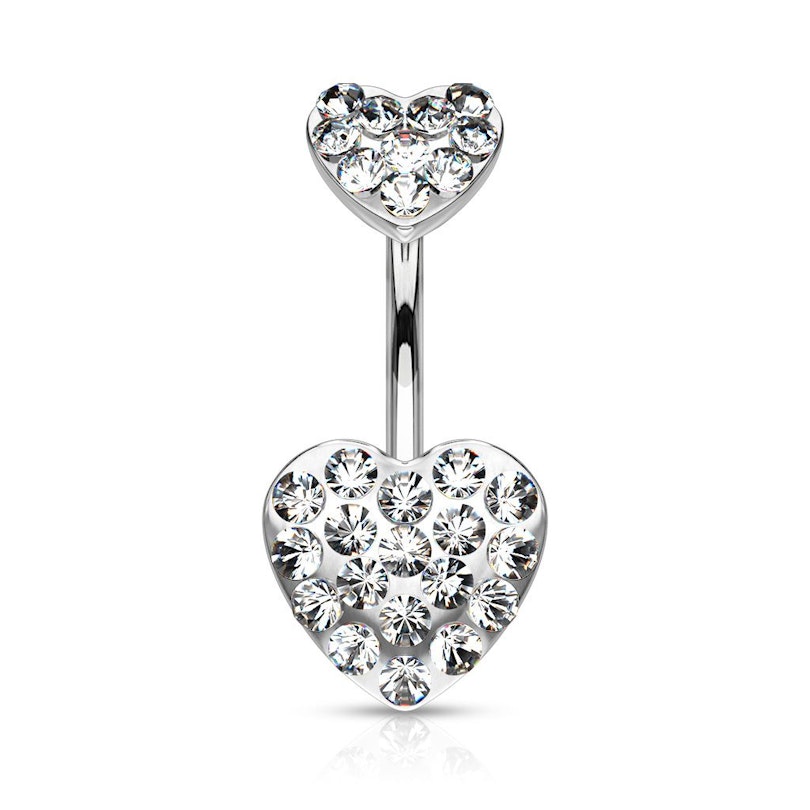 Nabas pīrsings ar divām kristāliem pārklātām sirdīm
