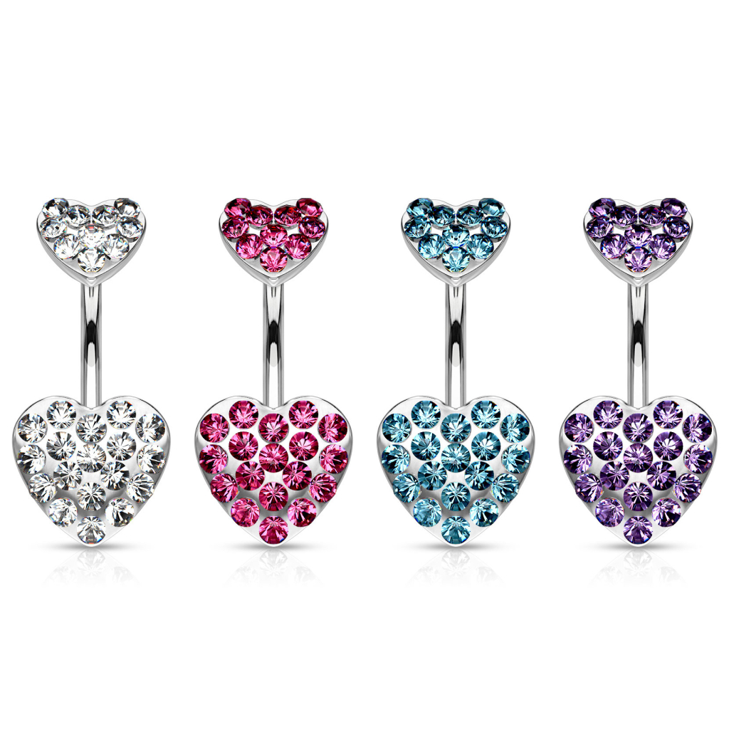 Nabas pīrsings ar divām kristāliem pārklātām sirdīm