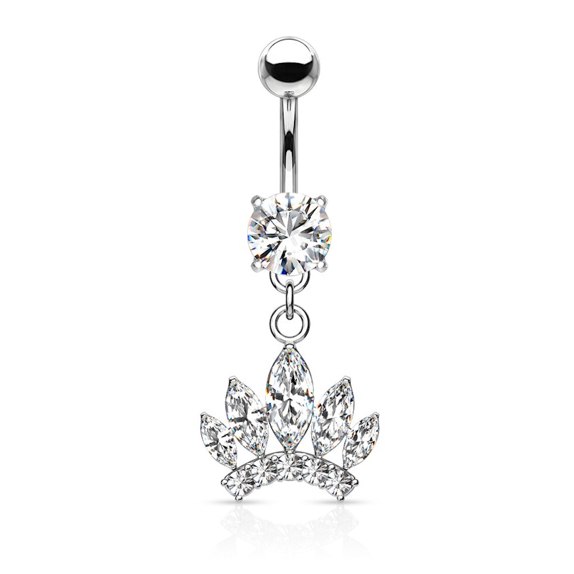Kļūstiet par princesi vai princi (kādēļ gan ne!?) tikmēr, kamēr jūs izrotāsiet savu nabu šo super jauko nabas pīrsinga stienīti, rotātu ar no kristāliem formētu kroņa piekariņu. Šis sievišķīgias kronis ir pārpildīts ar akmentiņiem: augšdaļa ir formēta no pieciem, iegareniem kristālien, vidējais ir visgarākais. Turklāt, kroņa apakšdaļā jūs atradīsiet nelielu rindiņu ar apaļiem kristāliņiem.