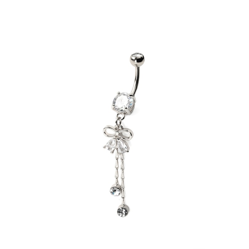 Šis nabas pīrsinga stienītis ir noteikti viens no visgarākajiem. Tā izmērs ir zem 2-3/8 collām (6 cm) no augšas līdz apakšai. Stienis ir 3/8 collas (10 mm) garš; pārējais ir dekorācijas, kuras sastāv no akmentiņiem, ķēdītēm un bantītes. Bante ir izgatavota no misiņa un zem tās ir divi akmentiņi. Turklāt viena ķēde ir garāka par otru. Nēsājot šo nabas rotu, ir svarīgi pievērst uzmanību ķēdītēm, jo tie viegli ieķeras drēbēs. Un, ja pie krasām kustībām, piekariņš nokritīs, kas gan ir labāk nekā salauzt visu stienīti. Šis nabas pīrsinga stienītis ir pieejams trīs dažādās krāsās: sudraba krāsas versija un divas zeltainas versijas. Vienīgā atšķirība starp abiem ir pārklājums; trīs no tiem ir identiskas dimensijas un dekorācijas.
