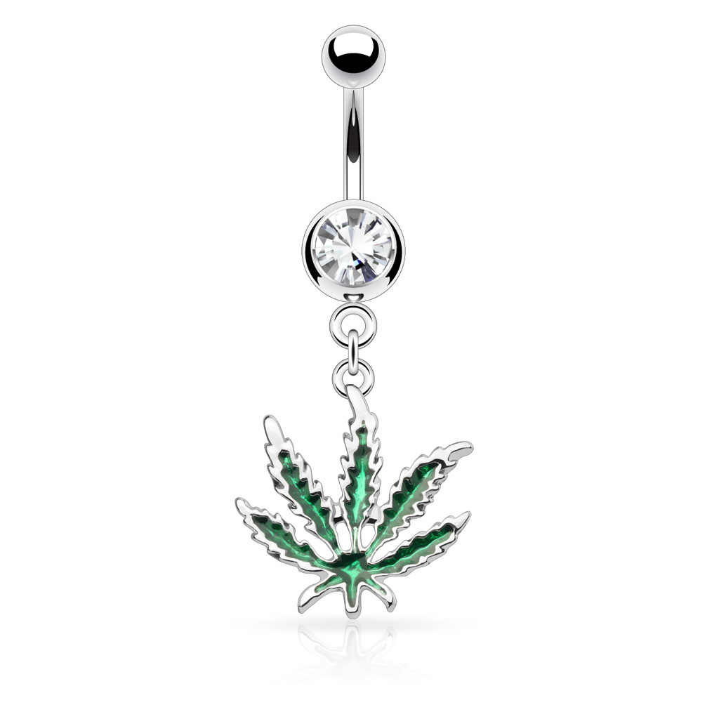 Šis ir vēdera pīrsinga gredzens ar klasisku dizainu, rāmi iestatītu dārgakmeni un apakšdaļas uzgali un marihuānas lapiņas piekariņu. Ja jūs meklējat īpašu nabas gredzenu, šis ir kā radīts jums.