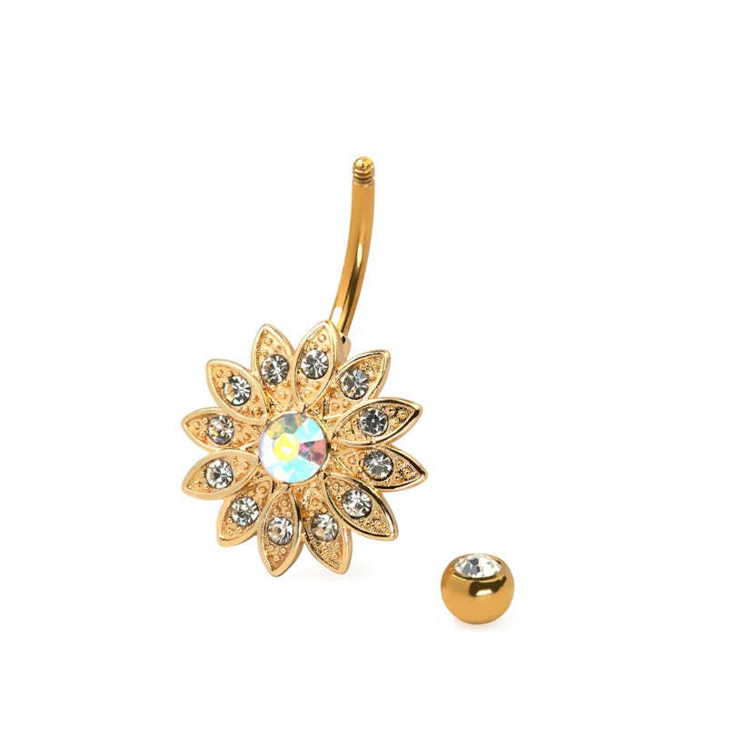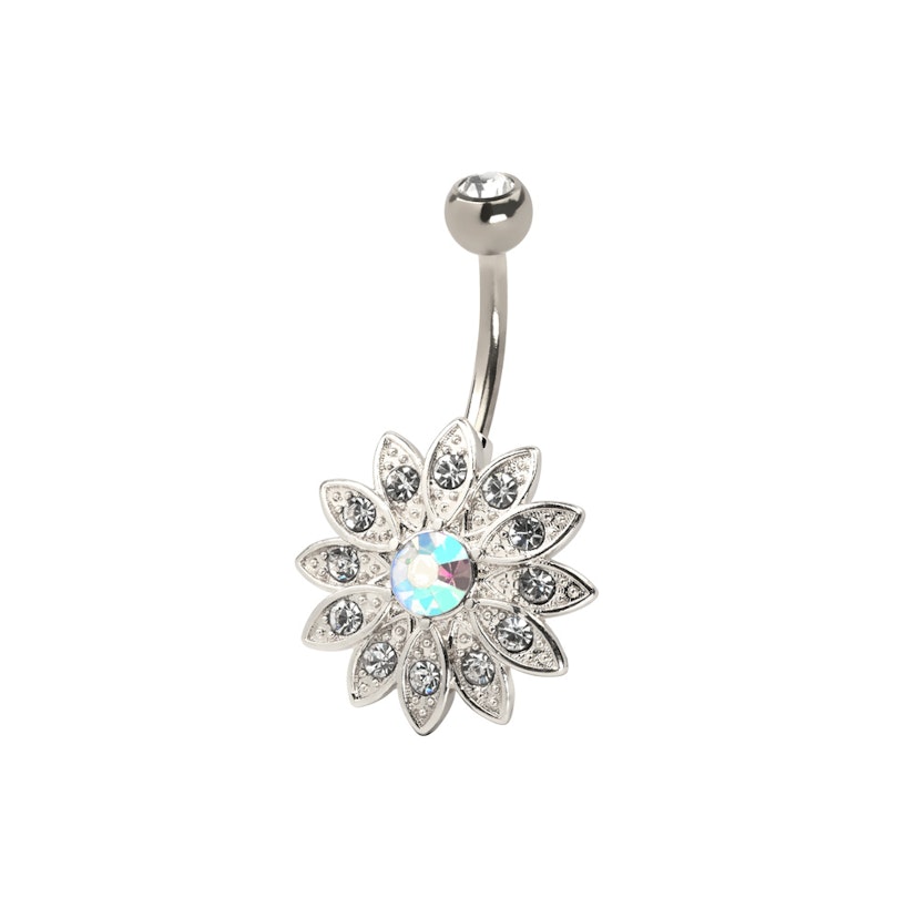 Pasakiet to ar ziediem, vai ar super skaistu ziedu kulonu! Šī ķirurģiskā tērauda nabas pīrsinga stienīša apakšdaļa, ir rotāta ar spilgtu ziedu. Augšdaļas uzgalī atrodas 3/16 collu (5 mm) rāmī iestatīts kristāls, kas rada lielisku kontrastu ar skaisto ziedu.