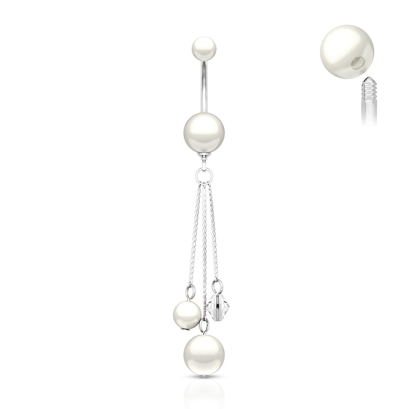 Šī ir jauka nabas pīrsinga rotaslieta, kas izgatavota no ķirurģiskā tērauda un izrotāta ar akrila pērlēm. Tas ir piemīlīgs un klasisks nabas stienītis ar ķēdīšu piekariņu. No apakšējās bumbiņas nokarājas trīs dažāda garuma ķēdītes ar asimetrisku dizainu. Vienai no bumbiņām ir dimanta forma. Visām bumbiņām un pērlītēm ir vienāda krāsa.