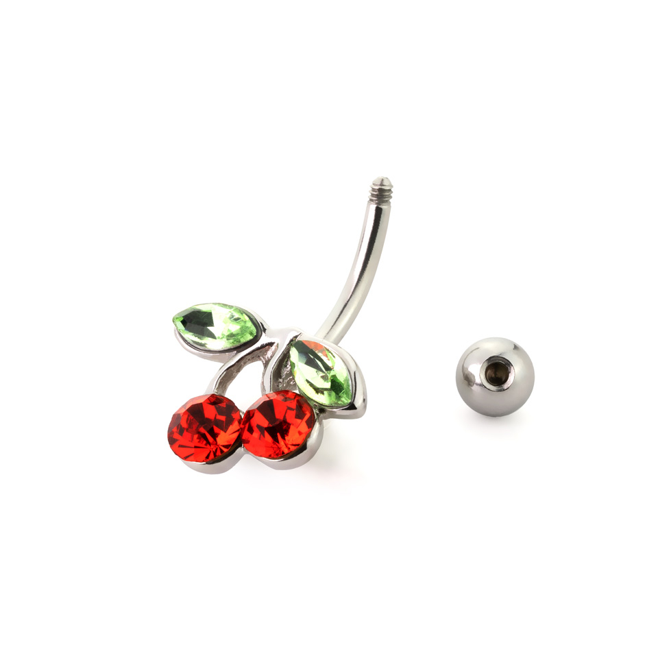 Kuram gan nepatīk saldo un garšīko ķiršu garša? Tagad jūs varat ar tiem dekorētu rotaslietu, izrotāt savu vēderu. Tas ir izgatavots no ķirurģiskā tērauda, dekorēts ar sarkanu ķiršu ķekariņu. Tam ir divas zaļas lapiņas, un gan ķirši, gan lapiņas ir rotātas ar skaistiem akmenti;nie - sarkanā un zaļā krāsā. Šim nabas pīrsingam nav piekariņu, jo ķirši ir apakšdaļas uzgaļa vietā. Tādēļ, tas ir lieliski piemērots nēsāšanai ikdienā, jo tam nav piekariņa, kas jums traucēs vai ieķersies jūsu drēbēs.
