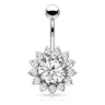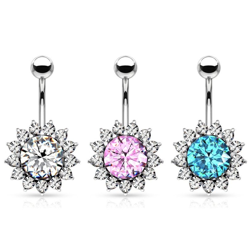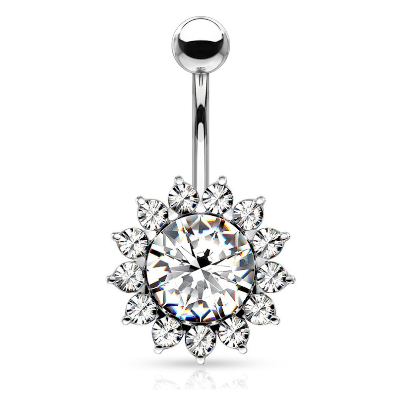 Šis burvīgais nabas pīrsinga stienītis ir dekorēts ar lielu kristālu, izliektā stienīša apakšdaļā, kas mirdz gaiši, sava lielā izmēra dēļ. Apmali, kas ieskauj lieli kristālu, pārklāj smalki kristāliņi, kas formē saulespuķes ziedlapiņas. Šī rotasliet atgādina saulaino saulespuķi, bet ar sapņainām krāsām.