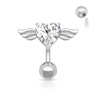 Iegādājieties savam nabas pīrsingam, vienu no populārākajiem tetovējumu simboliem. Runa, protams, iet par spārnoto sirdi. :-) Šis nabas pīrsinga stienītis ir izgatavots no ķirurģiskā tērauda, visplašāk izmantotā materiāla, ķermeņa pīrsingu rotaslietu izveidē, jo tas neizdala niķeļa daļiņas. Tā centrs ir rotāts ar skaisti briljanta slīpētu kristālu, pieejams dažādās krāsās.