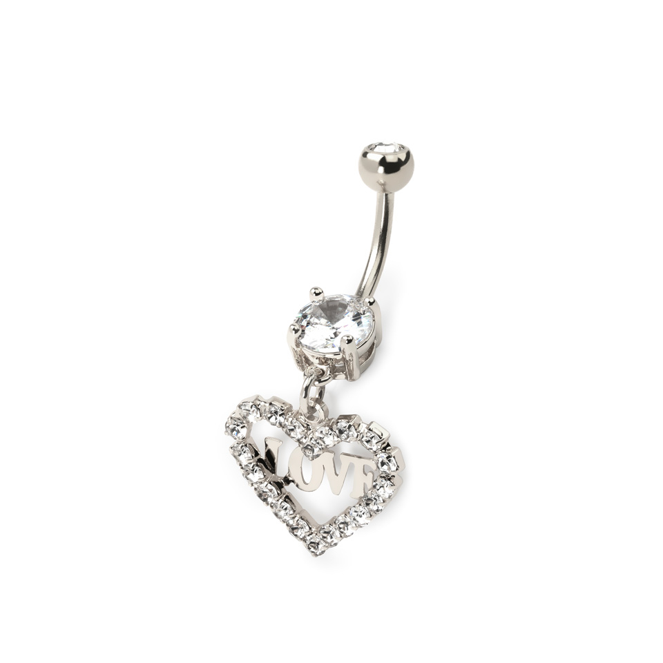 Nabas pīrsings ar sirds formas kristālu un tekstu love