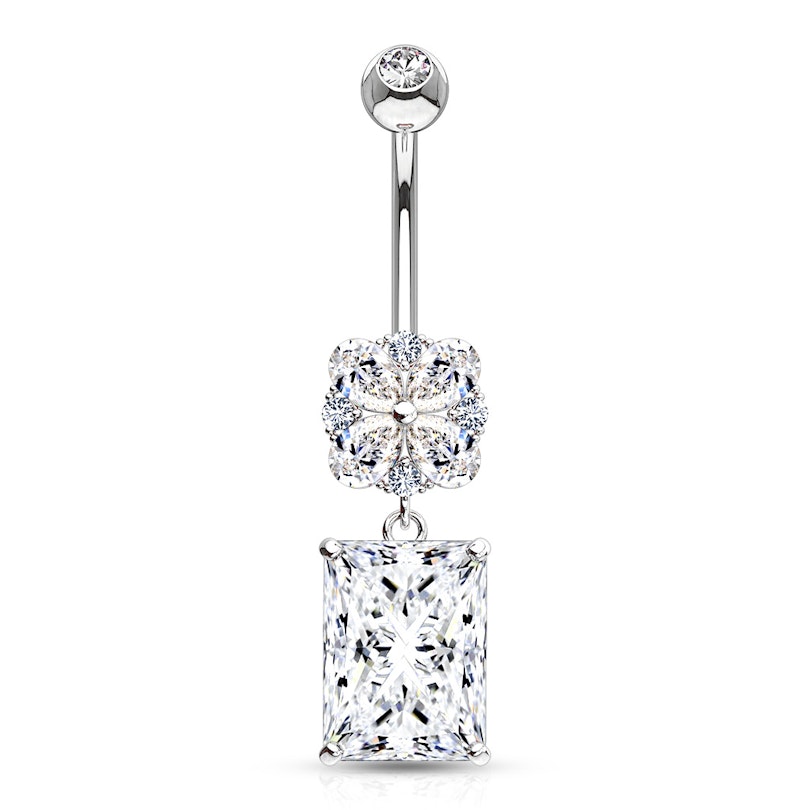 Šis skaistais un elegantais nabas pīrsinga gredzens ir izgatavots no 14 karātu zelta, un mēs droši varam teikt, ka tas lieliski iederas princešu pasaulē. Tas ir dekorēts ar lielu taisnstūra kristālu tā piekariņā, kuram ir satriecošais Asscher slīpējums. Slīpējumam ir vairāk kā 100 gadi, un tas tika radīts, kad Asscher brāļus nolīga Dāņu karaliskā ģimene, lai noslīpētu lielāko briljantu pasaulē. Šim slīpējumam ir raksturīgs taisnstūra formas kristāls, kura apmalē ir noslīpēti papildus slāņi, piešķirot briljantam optimālo efektu, lai tas varētu mirdzēt maksimāli spoži.