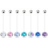 Attēlā ir redzami grūtnieču nabas pīrsinga stienīši. Tie atšķiras no parastajām rotām ar to, ka stienītis ir daudz garāks, turklāt tas ir lokans. Tas viegli pielāgojas Tavam augošajam vēderam. Šī nabas pīrsinga rota sastāv no stienīša, kas ir aptuveni 35 mm garš un izgatavots no PTFE, kas ir hipoalerģisks un lokans materiāls. Augšā atrodas ierastais bumbiņas uzgalis, un apakšdaļas uzgalis ir rotāts ar kristālu, kura krāsu Tu vari izvēlēties.