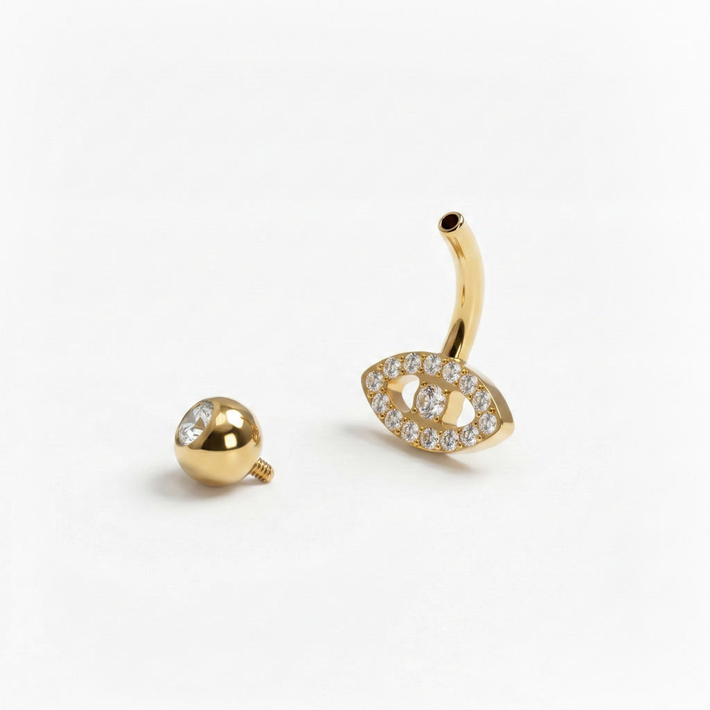 Nabas stienītis no titāna ar acs dizainu piešķir simbolisku pieskārienu Tavam nabas pīrsingam. Acs atrodas rotas centrā, un mazie akmentiņi, kas izkārtoti ap to, izceļ rotas formu. Tā ir izteiksmīga, taču reizē arī smalka un viegli nēsājama gan ikdienā, gan tad, kad vēlies paspilgtināt savu stilu. Pieejama ar zelta vai sudraba krāsas pārklājumu.
