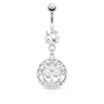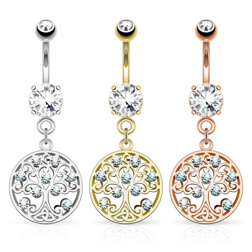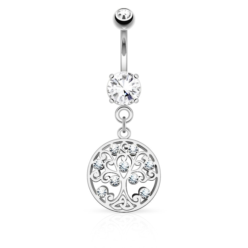 Šis ir skaits nabas pīrsinga stienītis ar dzīves koku, kas ir ierāmēts apļveida kulonā.