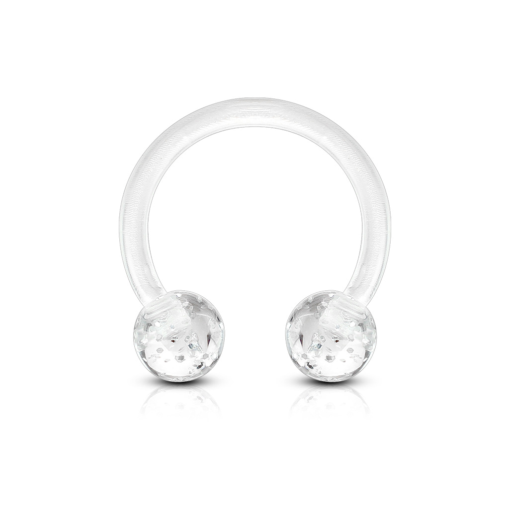Augšā redzamajā attēlā, jūs ieraudzīsiet burvīgu, apļveida stienīti, izgatavotu no akrila, rotātu ar spīdumiem pārklātiem, bumbiņveida uzgaļiem. Šis apļveida stienītis ir pieejams dažādās krāsās, piemēram zils, sarkans un rozā. Stienīša krāsa nebūs identiska ar tā uzgsļiem. Piemēram, zilam stienītim ir gaišākas zilās krāsas stienis par spīdumiem pārklātajiem uzgaļiem. Turklāt, šie pakaviņi ir lokani, kas padara to ievietošanu pīrsingā, pavisam vieglu.