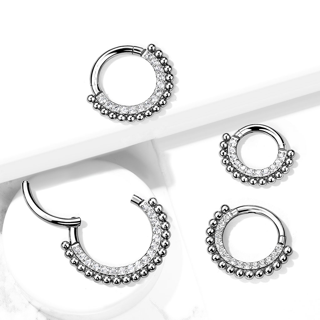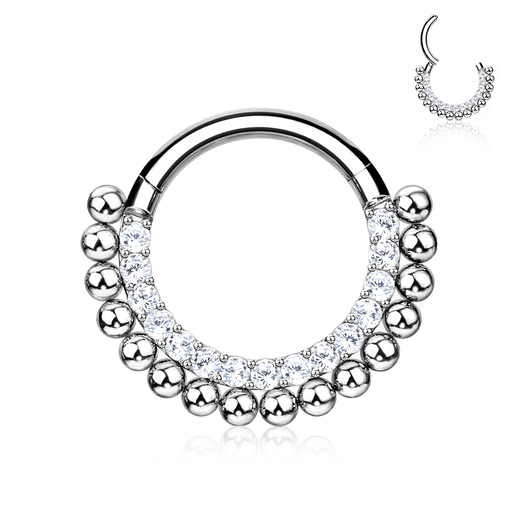 Pīrsingu gredzens ar eņģīti no titāna ar lodītēm un akmentiņiem
