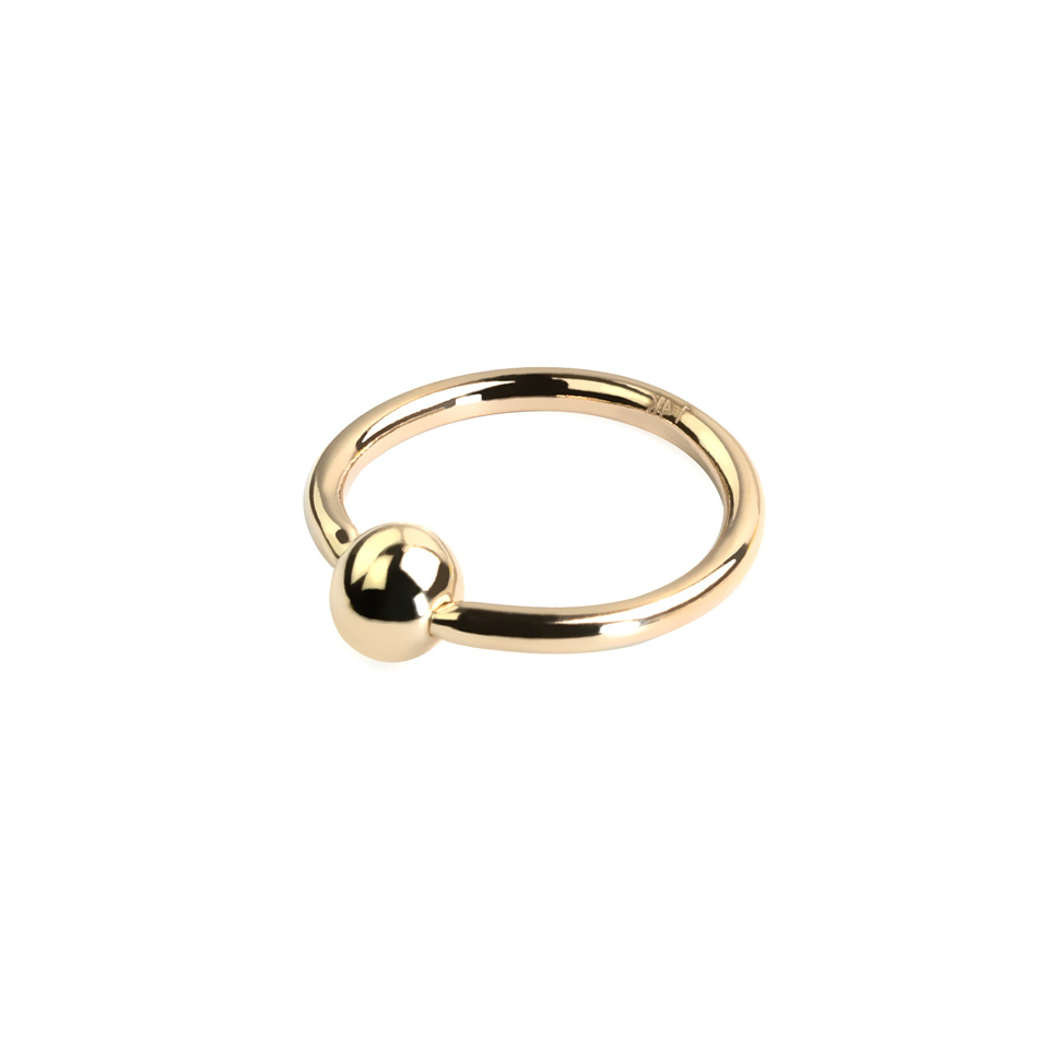 Skaists un vienkāršs pīrsingu gredzens ar satvertu lodīti jeb "captive bead ring". Klasisks dizains ekskluzīvā materiālā - tas ir izgatavots no 14 karātu zelta. Lieliski piemērots tiem, kuri novērtē kvalitāti.
