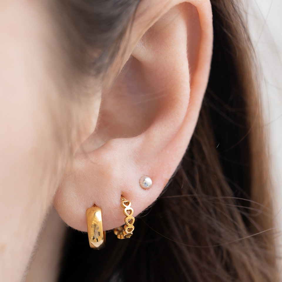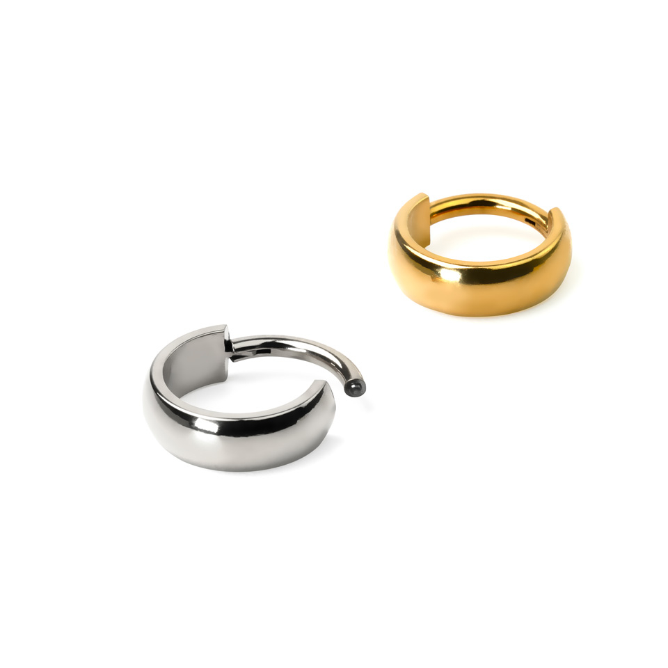 Piedāvājam pīrsingu gredzenu ar neatkārtojamu kvalitāti, klasisku dizainu un ērtu formu. Tā platā dekoratīvās stīpas daļa pārvērš rotu par tik iecienīto riņķveida auskaru, savukārt pīrsingā ievietojamais, ar eņģīti kustināmais segments (1,2 mm biezs),kalpo arī kā riņķa (pieejams 8 mm un 10 mm diametrā) aizdare.