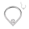 Piedāvājam fantastisku segmentēto pīrsingu gredzenu ar eņģīti, kura dekoratīvā daļa ir ševrona formā un ir rotāta ar vairākiem kristāliņiem - tā ieskauj apaļas formas kubiskā cirkonija akmentiņu.
