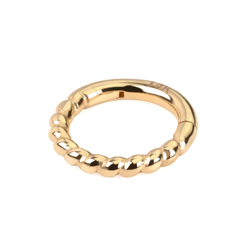 Kad attēlā redzamā pīrsingu gredzena riņķis ir noslēgts, tas izskatās pēc "endless" tipa riņķa. Tomēr tam ir ar eņģītes palīdzību kustināms posms, kuru var viegli pacelt, lai atvērtu riņķi vai to iespiestu virzienā uz leju, lai noslēgtu riņķi ar dzirdamu klikšķi. Pīrsingu gredzens ir izgatavots no 14 karātu zelta: pieejams gan no dzeltenā, gan baltā zelta. Ir pieejami modeļi ar dažādiem diametriem - tas ļaus Tev izvēlēties sev piemērotāko izmēru savam pīrsingam.