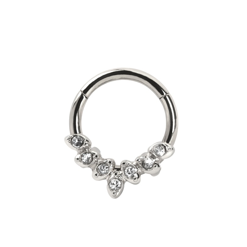 Pīrsingu gredzenam ir PVD pārklājums, kurš tiek izmantots, lai sniegtu noturīgus krāsu variantus. To rotā vairāki kubiskā cirkonija kristāli: centrālā asaras formas kristāla abos sānos dzirkstī trīs apaļas formas kristāliņi. Tāpat kā pīrsingu gredzena struktūra, arī šo 7 kristāliņu "diadēma" ir pieejama dažādās krāsās.