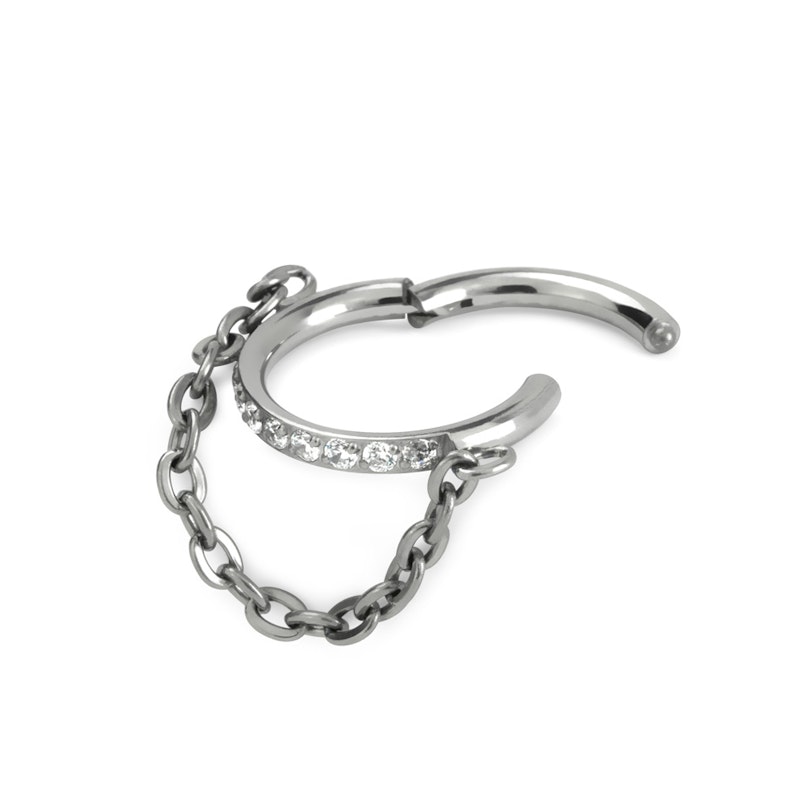 Titāna pīrsingu gredzens, kas rotāts ar akmentiņiem un dekoratīvu ķēdīti. Ķēdīte piestiprināta gredzena abās pusēs, apmēram viduslīnijā, lai tā karātos nedaudz zem gredzena zemākās daļas.