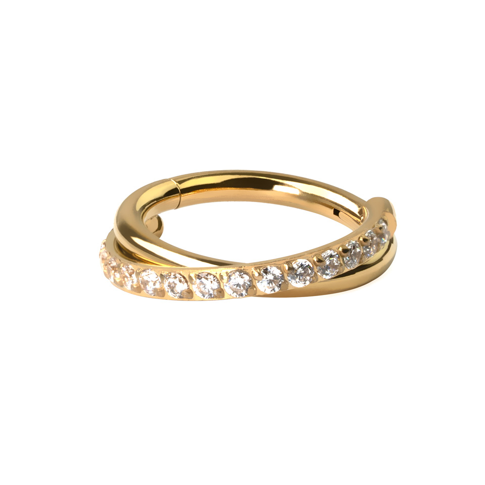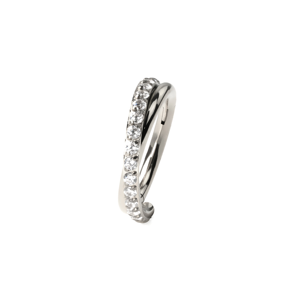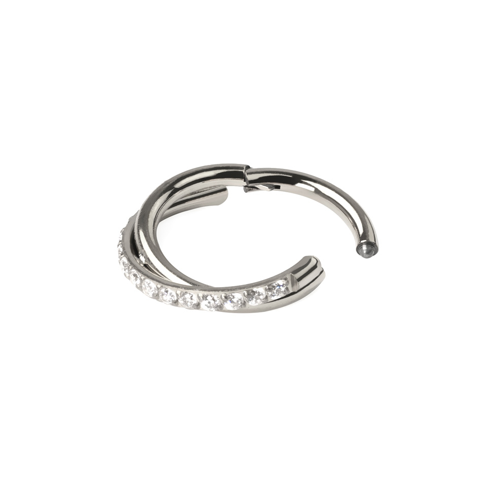 Piedāvātā modeļa krusteniskais dizains un ar pavé rakstā izklātajiem kristāliem rotātā stīpa piešķirs Tavam stilam elegantu un dzirkstošu piesitienu. Lielisks aksesuārs auss ļipiņas, helix, daith un rook pīrsingiem.