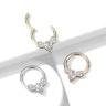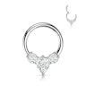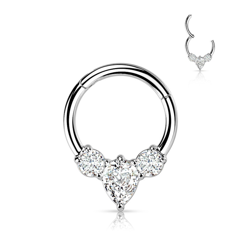 Dekoratīvais elements, kuru veido divi apaļi un viens centrālais, lāses formas, kristāls transformē šo pīrsingu rotu arī par satriecošu auskariņu. Tomēr, ņem vērā, ka kristāldzidrie akmentiņi atrodas riņķa priekšpusē, tādēļ tas vislabāk būs piemērots septum un tādiem auss pīrsingiem kā daith un tragus.