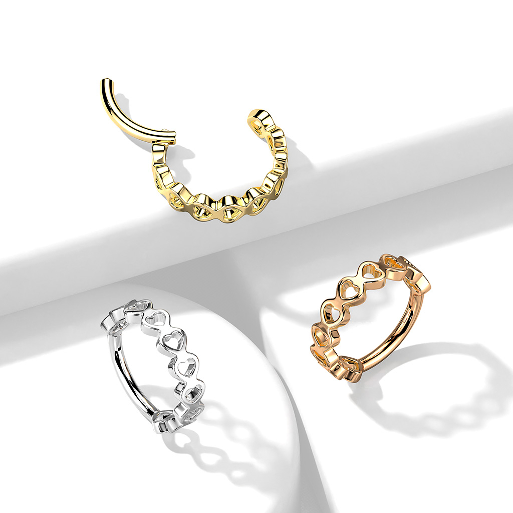 Pīrsingu gredzens ar sarindotām sirdsveida formām riņķa ārējā pusē