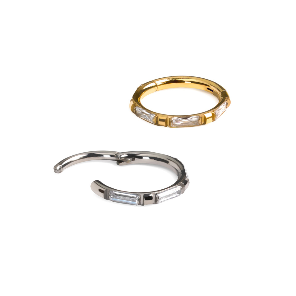 Šis pīrsingu gredzens no titāna ar bagetes slīpējuma akmentiņiem ir ļoti stilīgs: tajā pamīšus izkārtoti taisnstūra formas cirkonija akmentiņi ar bagetes slīpējumu un mazi metāla kvadrātiņi gredzena ārmalā. Tā kā šī pīrsingu gredzena aizdares mehānisms ir eņģīte, to ir ļoti viegli ievietot Tavā pīrsingā un nostiprināt. Rota izgatavota no titāna, kas nozīmē, ka tā ir hipoalerģiska, izturīga un ūdensizturīga.