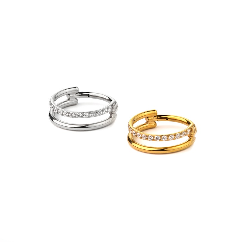 Pīrsingu gredzens no titāna ar divām stīpām un kristāliņu rindu