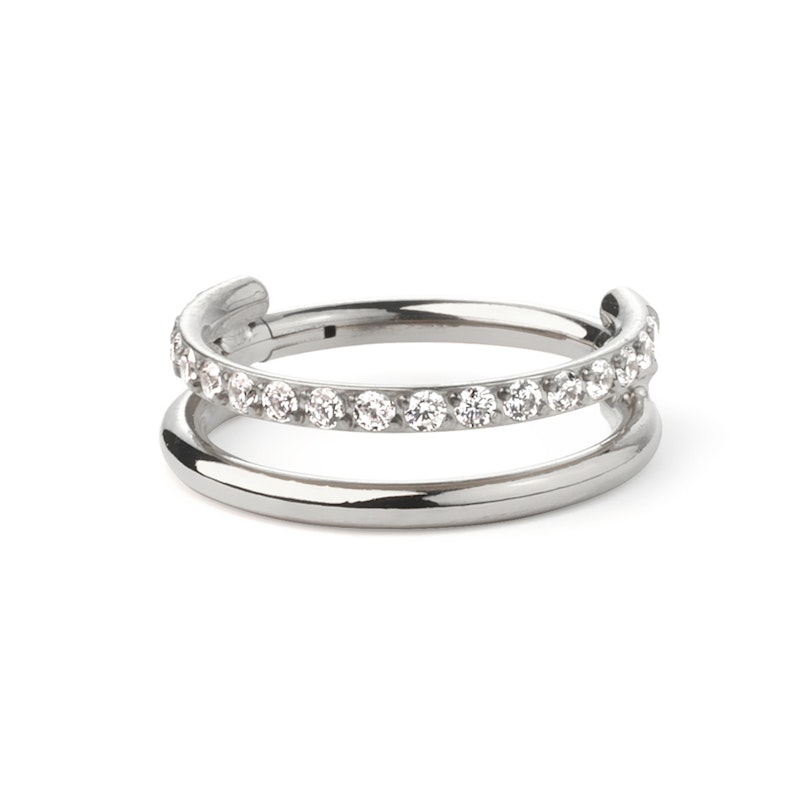 Nosaukums: Pīrsingu gredzens no titāna ar divām stīpām un kristāliņu rindu