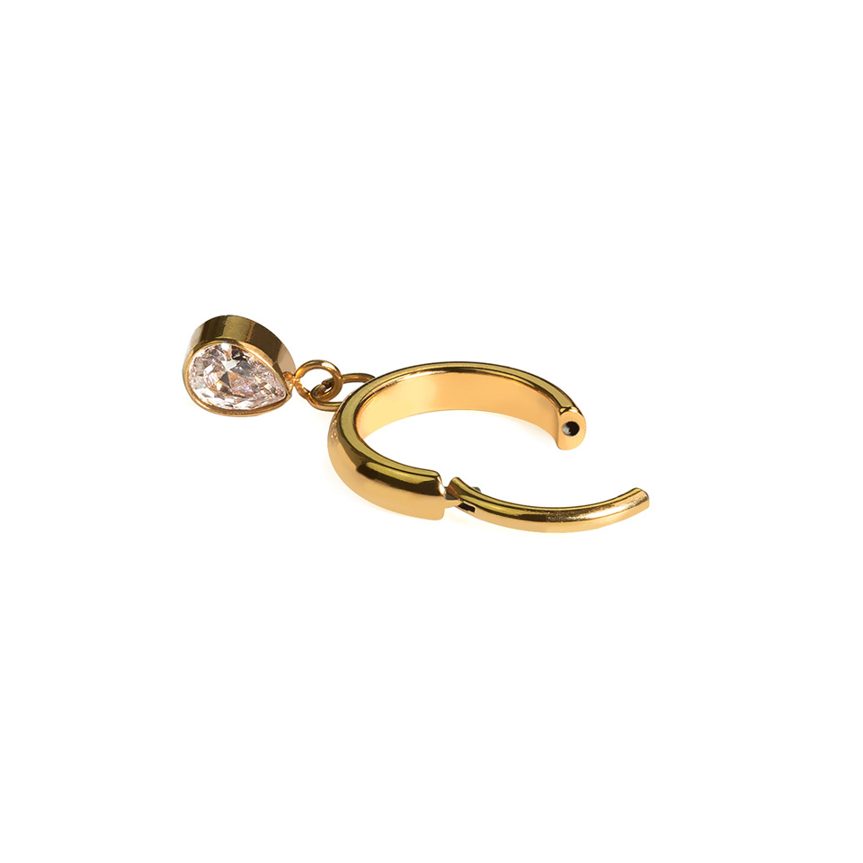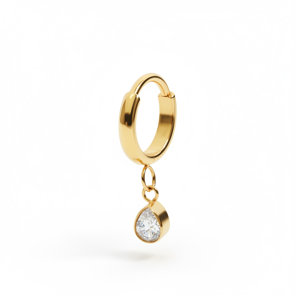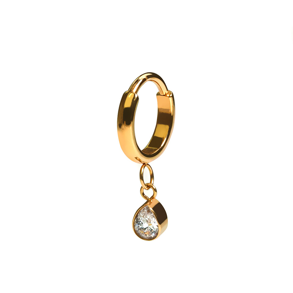 Šis stilīgais pīrsingu gredzens ir 2 mm plats un tas ir nedaudz ieliekts, izņemot to daļu, kas iet cauri Tavam pīrsingam un kuras vītnes biezumu Tu vari izvēlēties (1 mm vai 1,2 mm). Pīrsingu gredzenu izrotā ietvarā iestrādāts lāsītes formas piekariņš ar cirkoniju, kas piestiprināts pie gredzena ar diviem smalkiem riņķīšiem. Lāsītes izmērs ir 4,5 mm.