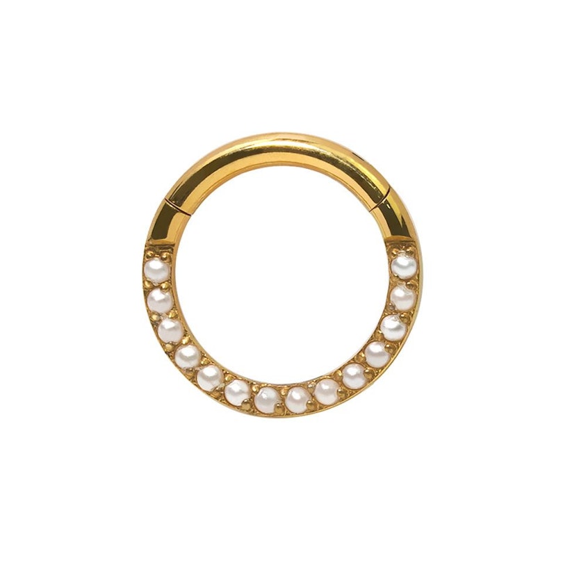 Šī pīrsingu gredzena aizdares mehānisms ir eņģīte un priekšpusē tas ir izrotāts ar sintētiskajām pērlēm. Perfekti piemērots tādiem pīrsingiem kā septum vai daith.