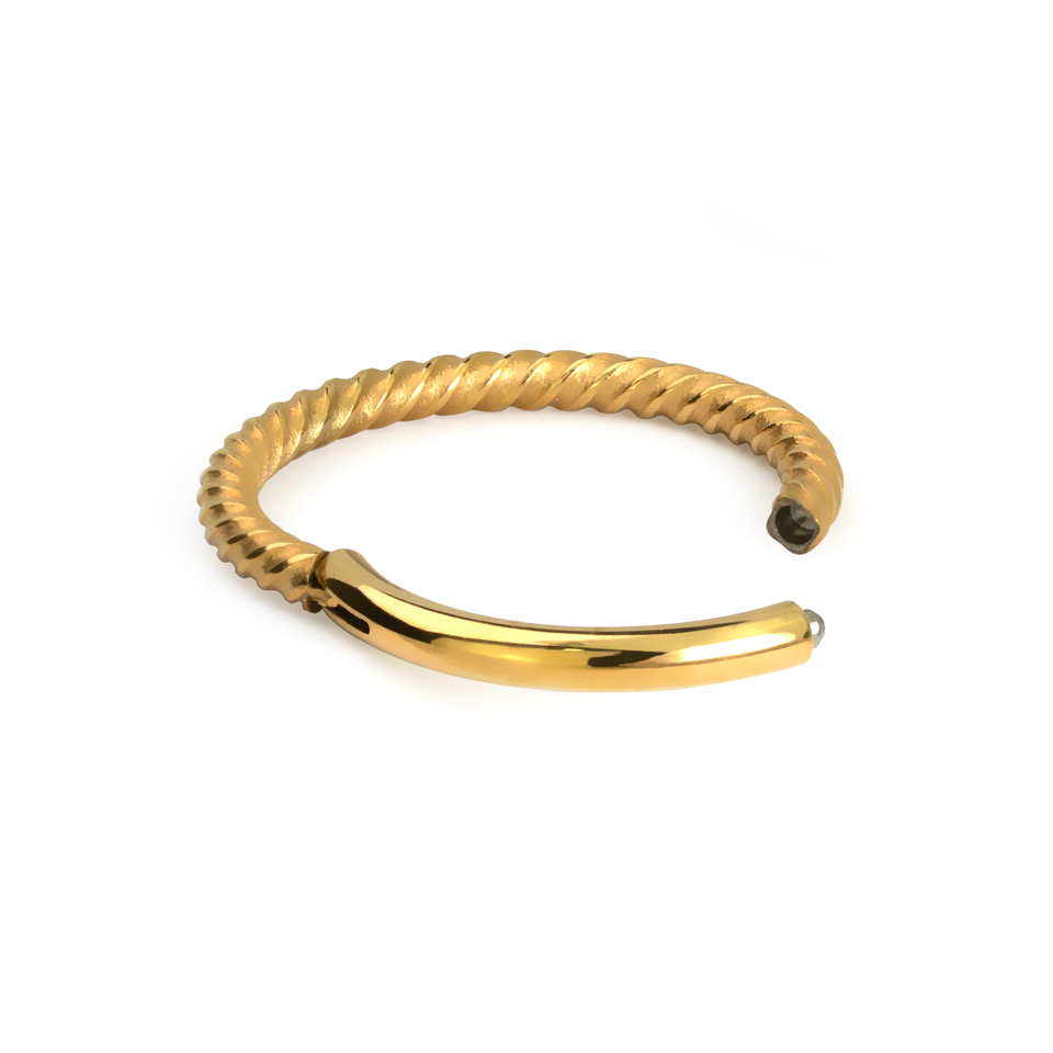 Šis ir klasisks "endless" jeb viengabala pīrsingu gredzens ar pinuma rakstu. Pateicoties tās pārdomātajam dizainam, uzreiz pamanīt to, kur riņķi var atvērt un noslēgt nebūs vienkārši. Piedāvātajam modelim nav nekādu noņemamu detaļu, tā vietā tam ir ar eņģīti kustināms riņķa posms.