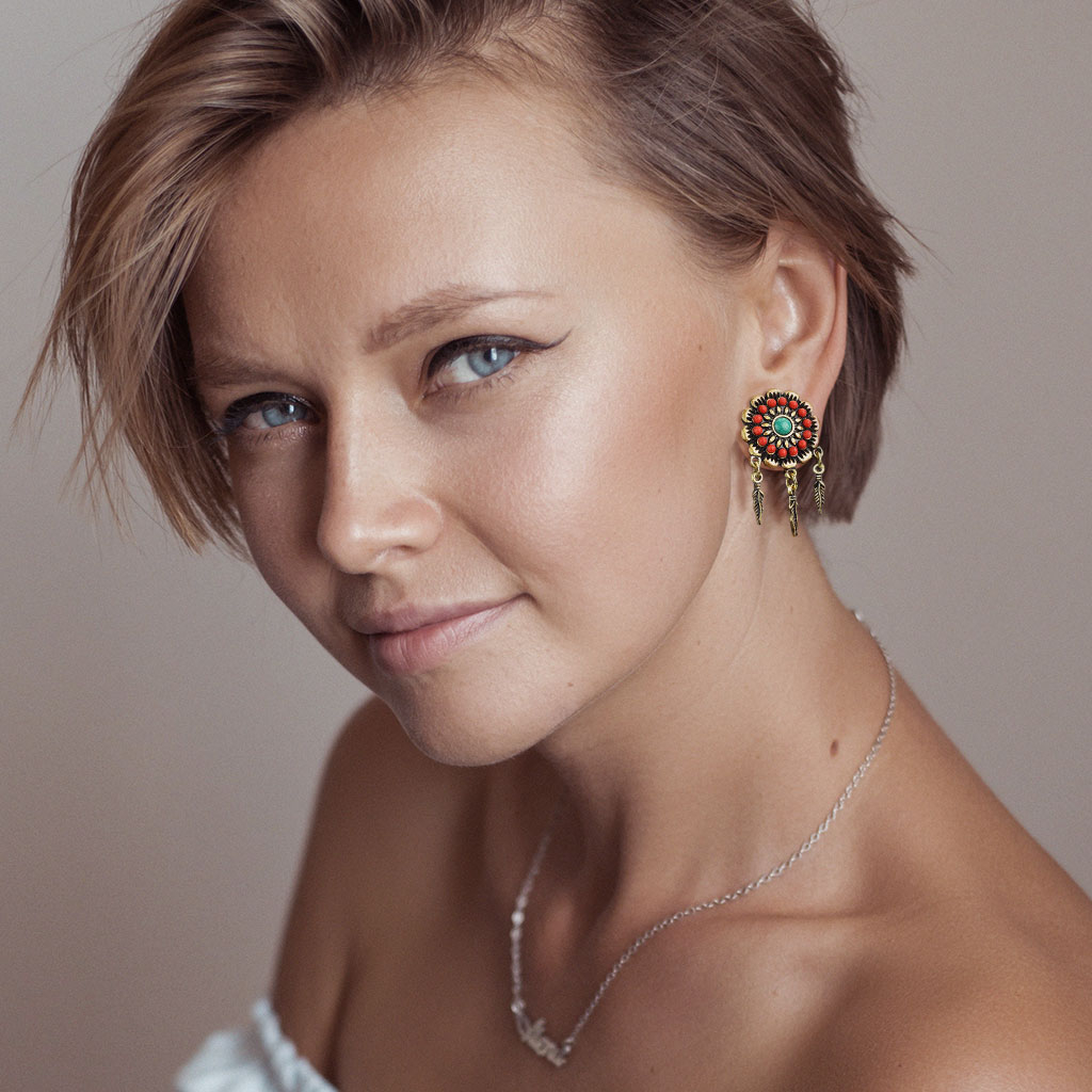 Šim plugam ir dekoratīva priekšpuse, kura atgādina ziedu. Zieda centrā ir tirkīza akrila pērlīte, kura brīnišķīgi saskan ar sarkano pērlīšu apli. Ap pluga malu ir rāmis, kas sastāv no mazām lapiņām, liekot ziedam izcelties. Detalizēts ir ne tikai zieds. No pluga nokarājas trīs spalvas, kuras sekos līdz jūsu ķermeņa kustībām.